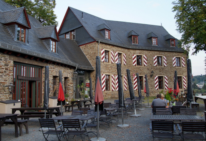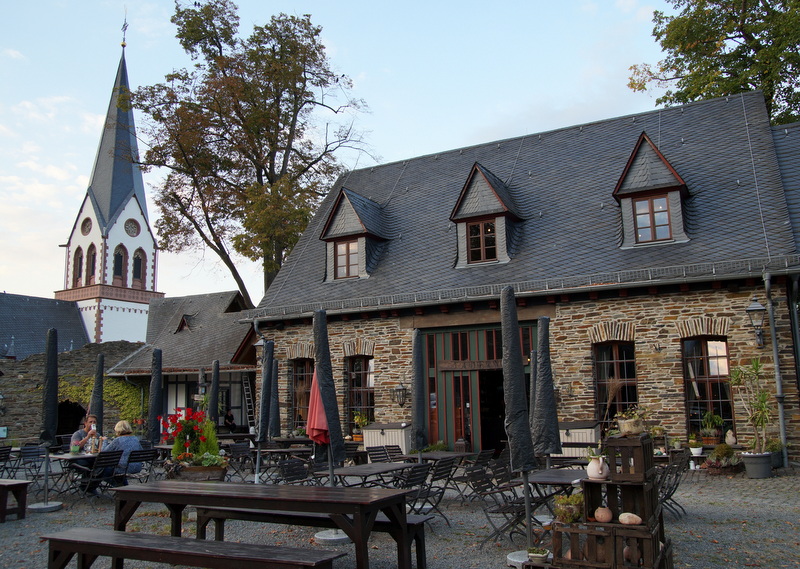 Knapp 20 Minuten Fahrt von der Ranch entfernt befindet sich Kastellaun, ein hübsches Örtchen mit allerlei Einkaufsmöglichkeiten. Mitten im Ortskern ist auf einer Anhöhe die Ruine einer alten Burg zu finden, die sehr sehenswert ist und wo es auch eine Taverne mit leckerem Essen, einen Biergarten und einen „Kerker“ gibt. Ob frischer Salat, Flammkuchen oder zünftiges Steak oder Spare Ribs vom Lavagrill, hier bleibt niemand hungrig. Brave Hunde dürfen mit. Hier ein paar Fotos der Burg und der Taverne, eine ganz besondere Atmosphäre!